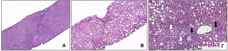 Εικόνα 1.Εικόνες μικροσκοπίου βιοψιών με βελόνα από: Α. Φυσιολογικό ήπαρ (μεγέθυνση x40), Β. Ήπαρ με απλή στεάτωση (οι λευκοί κύκλοι αντιστοιχούν στο λίπος μέσα στα ηπατοκύτταρα) (x40), Γ. Ήπαρ με στεατοηπατίτιδα, όπου επιπλέον της στεάτωσης υπάρχει ηπατοκυτταρική διόγκωση (λευκά βέλη) και φλεγμονή (μαύρα βέλη) (x100).
