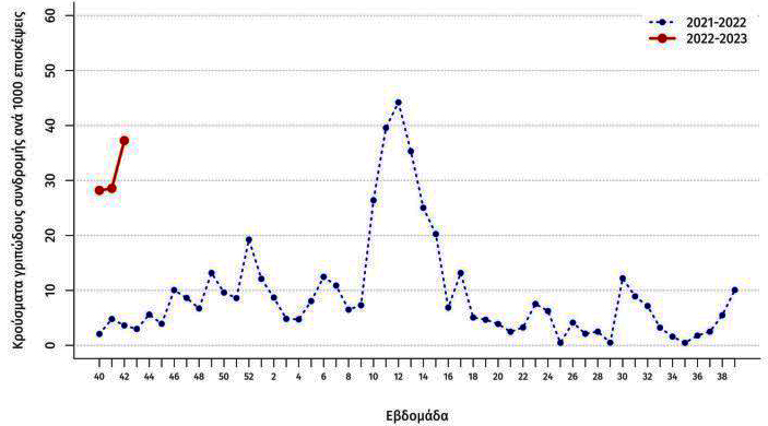 Όπως φαίνεται στο γράφημα που ακολουθεί, η τάση των κρουσμάτων "γριπώδους συνδρομής" είναι αυξητική και πολύ υψηλότερα από την περυσινή περίοδο, κατά την οποία ο κορωνοϊός είναι υπερκεράσει τους ιούς της γρίπης.