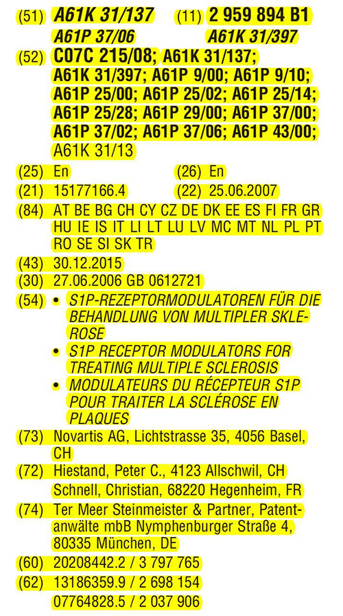 Όπως αναφέρεται και στο site της εταιρείας,"Η Novartis χαιρετίζει την απόφαση του Ευρωπαϊκού Γραφείου Διπλωμάτων Ευρεσιτεχνίας στις 8 Φεβρουαρίου (2022) που αναγνωρίζει την καινοτομία μας με την εντολή να χορηγηθεί το ευρωπαϊκό δίπλωμα ευρεσιτεχνίας για το Gilenya 0,5 mg ημερήσιας δόσης (λήξη 2027). Αυτή η απόφαση σημαίνει ότι το ευρωπαϊκό δίπλωμα ευρεσιτεχνίας στις καθορισμένες χώρες θα καλύπτει όλα τα γενόσημα με ευρωπαϊκές εγκρίσεις μάρκετινγκ για τη φινγκολιμόδη 0,5 mg".