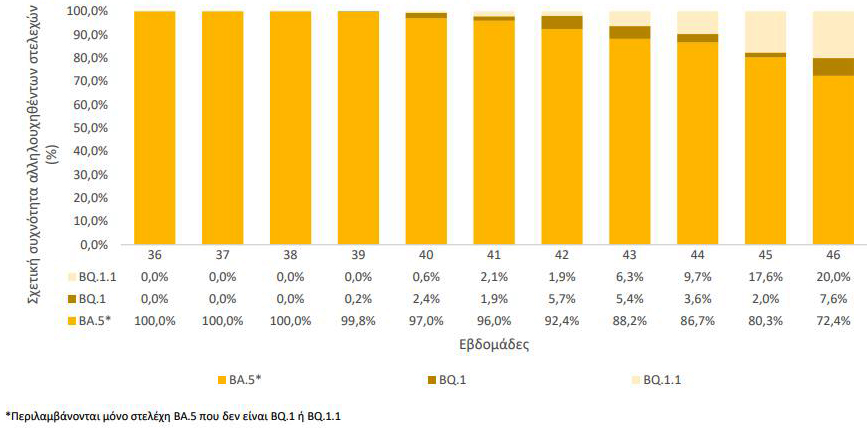 Την εβδομάδα 19 έως 25 Σεπτεμβρίου (38η του έτους), δεν είχε απομονωθεί στην Ελλάδα κανένα στέλεχος των συγκεκριμένων υπο-παραλλαγών και Όμικρον 5 κυριαρχούσε πλήρως, όπως φαίνεται στο γράφημα που ακολουθεί.