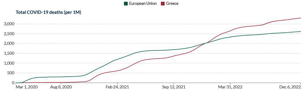 Σύμφωνα με τα στοιχεία του Ευρωπαϊκού Κέντρου Ελέγχου Νοσημάτων (ECDC), από την αρχή της πανδημίας η Ελλάδα κατέχει την ένατη χειρότερη θέση στην Ευρωπαϊκή Ένωση, με 3.213 θανάτους ανά εκατομμύριο πληθυσμού. Το 2022, που σε λίγες μέρες μάς αφήνει, ήταν "μαύρο" για την Ελλάδα.