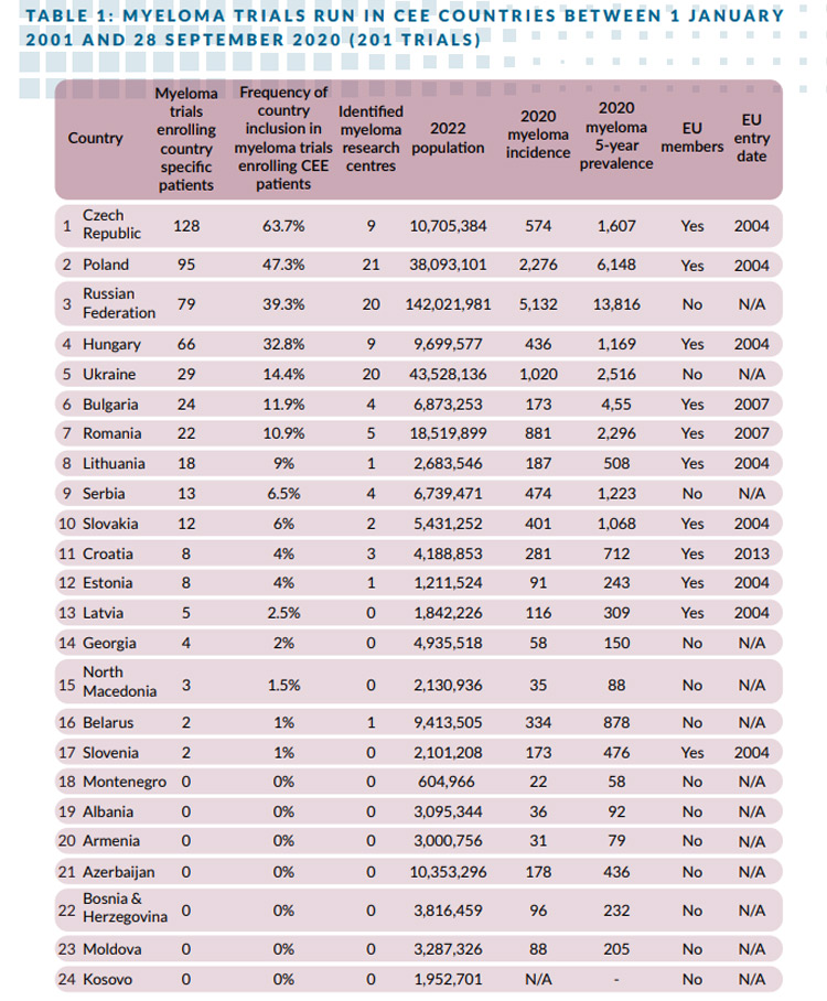 Με επικεφαλής την ομάδα εργασίας MPE CEE για την πρόσβαση, η έκθεση – Αντιμετώπιση φραγμών πρόσβασης στις κλινικές δοκιμές μυελώματος στην Κεντρική και Ανατολική Ευρώπη – αξιολόγησε τον αριθμό των κλινικών δοκιμών που πραγματοποιήθηκαν σε χώρες της ΚΑΕ μεταξύ 1ης Ιανουαρίου 2001 και 28ης Σεπτεμβρίου 2020.