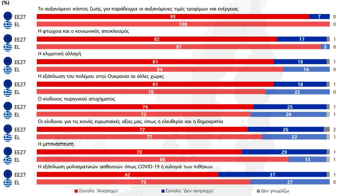 Στην ερώτηση για το ποιο θέμα τούς ανησυχεί περισσότερο, σε σχέση με τους ίδιους και τους κοντινούς τους ανθρώπους, το 73% των Ελλήνων δηλώνουν ανήσυχοι για θέματα, όπως η εξάπλωση μολυσματικών ασθενειών, όπως CoViD ή ευλογιά των πιθήκων.