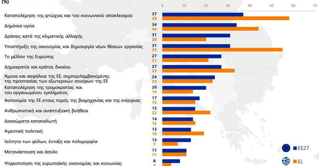 Όπως δείχνει το πιο κάτω γράφημα, η Δημόσια Υγεία βρίσκεται στη δεύτερη θέση μετά την καταπολέμηση της φτώχειας και του κοινωνικού αποκλεισμού, με το 44% των συμμετεχόντων από την Ελλάδα να ζητούν αντιμετώπιση κατά προτεραιότητα, έναντι μόλις 34% των Ευρωπαίων.