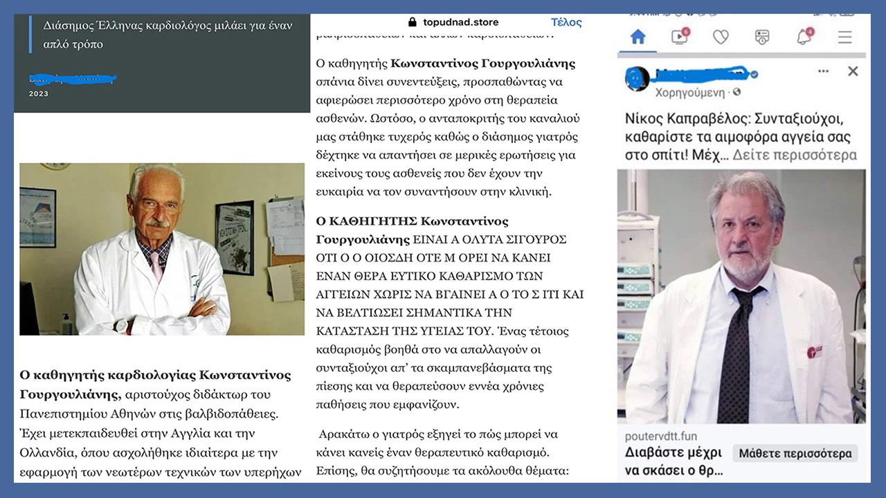Σε αναρτήσεις στο διαδίκτυο και στα μέσα κοινωνικής δικτύωσης, γνωστοί γιατροί και καθηγητές πανεπιστημίου εμφανίζονται δήθεν να διαφημίζουν την "θαυματουργή" δράση σκευασμάτων, με τα οποία μπορεί κάποιος να καθαρίσει "στο σπίτι" τα αιμοφόρα αγγεία και να προλάβει το εγκεφαλικό επεισόδιο.
