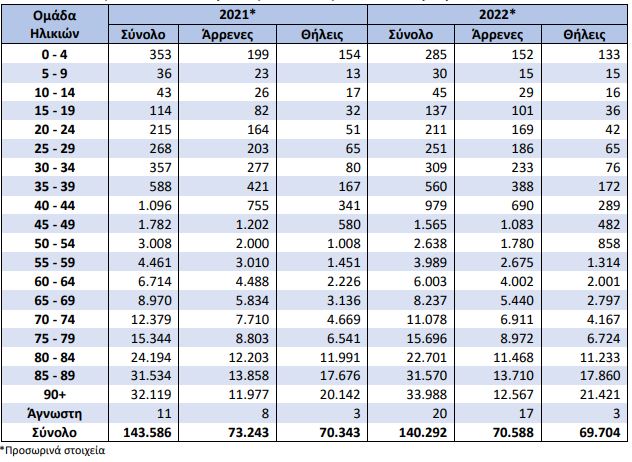 Σύμφωνα με τα στοιχεία, οι θάνατοι στην Ελλάδα κατά τις 52 εβδομάδες του 2022 ανήλθαν σε 140.292 (70.588 άνδρες και 69.704 γυναίκες), ενώ κατά τις πενήντα δύο (52) εβδομάδες του 2021 είχαν ανέλθει σε 143.586 (73.243 άνδρες και 70.343 γυναίκες).