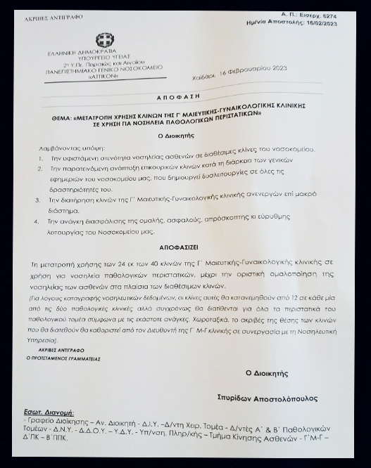 Όπως καταγγέλλεται από την Ομοσπονδία εργαζομένων στα νοσοκομεία (ΠΟΕΔΗΝ), μετακινούνται 24 ασθενείς που δεν μπορούν να απορροφηθούν από τις παθολογικές κλινικές, στη μαιευτική κλινική του νοσοκομείου, δυναμικότητας 40 κλινών.
