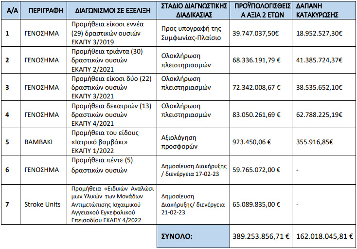 Στη συγκρότηση επιτροπής διενέργειας και αξιολόγησης των αποτελεσμάτων του διαγωνισμού, για τη σύναψη συμφωνίας πλαίσιο για την προμήθεια "Ειδικά Αναλώσιμα Υλικά των Μονάδων Αντιμετώπισης Ισχαιμικού Αγγειακού Εγκεφαλικού Επεισοδίου", με CPV: 33162200-5 (Εργαλεία χειρουργείου), CPV 33111200-3 Υλικά αγγειογραφίας, CPV 33111710-1 "Υλικά αγγειοπλαστικής", χρονικής διάρκειας τεσσάρων (4) ετών  προχώρησε η Εθνική Κεντρική Αρχή Προμηθειών Υγείας. Η προϋπολογισθείσα δαπάνη ανέρχεται στα 65.089.834,60 ευρώ (για τα δύο έτη) μη συμπεριλαμβανομένου ΦΠΑ. Ο συγκεκριμένος διαγωνισμός περιλαμβάνεται και στην έγκριση του Στρατηγικού Σχεδίου Κεντρικών Προμηθειών της ΕΚΑΠΥ (12-1-2023), ενώ η ημερομηνία δημοσίευσης του διαγωνισμού είναι στις 21/2/2023.