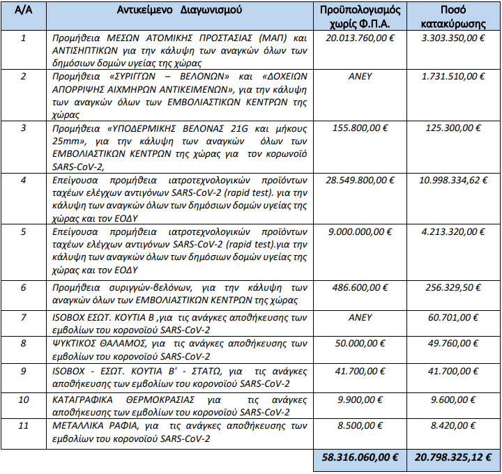 Την ίδια στιγμή, η Ε.Κ.Α.Π.Υ. στο πλαίσιο των αρμοδιοτήτων της και για την αποφυγή της εξάπλωσης της Πανδημίας του κορωνοϊού SARS-CoV-2, διενεργεί διαγωνισμούς -προσκλήσεις με τη διαδικασία του επείγοντος, για τη συλλογή προφορών, με βάση τις σχετικές Πράξεις Νομοθετικού Περιεχομένου για τα ακόλουθα είδη, τα οποία προορίζονται για χρήση από όλους τους φορείς υγείας, κατόπιν εντολής του Κεντρικού Συμβουλίου Υγειονομικών Περιφερειών (Κε.Συ.Πε.).