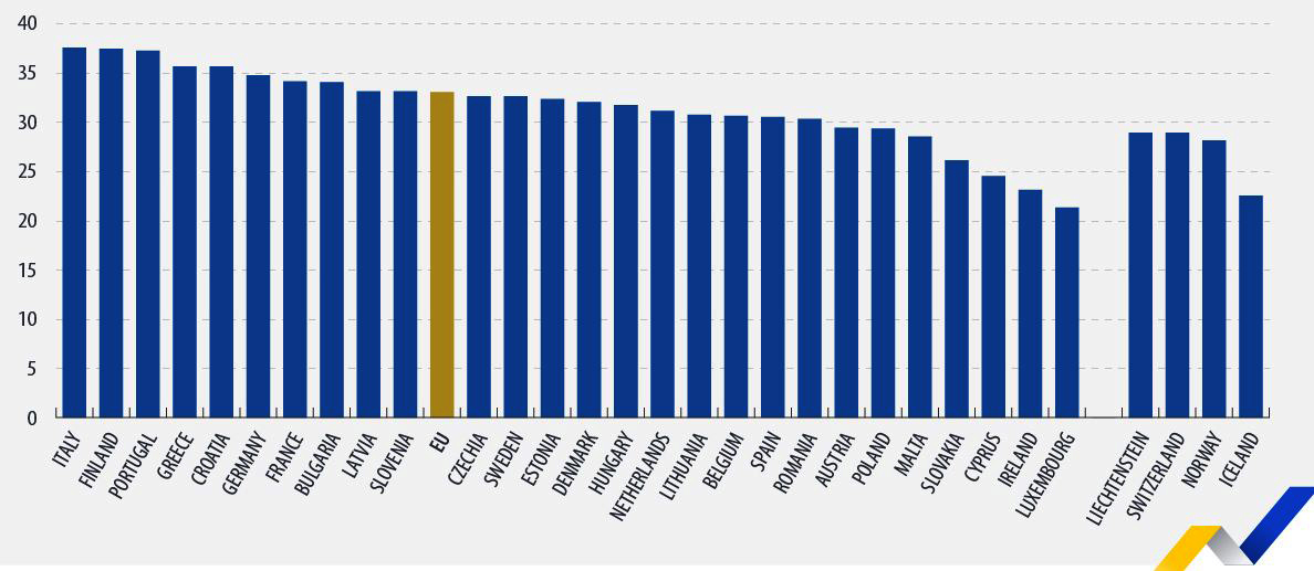 Ο δείκτης αυτός διέφερε μεταξύ των μελών της Ευρωπαϊκής Ένωσης, αλλά παρέμεινε πάνω από το 20% στο σύνολό τους. Τα υψηλότερα ποσοστά καταγράφηκαν στην Ιταλία (37,5%), στη Φινλανδία (37,4%) και στην Πορτογαλία (37,2%), ενώ τα χαμηλότερα στο Λουξεμβούργο (21,3%), στην Ιρλανδία (23,1%) και στην Κύπρο (24,5%).