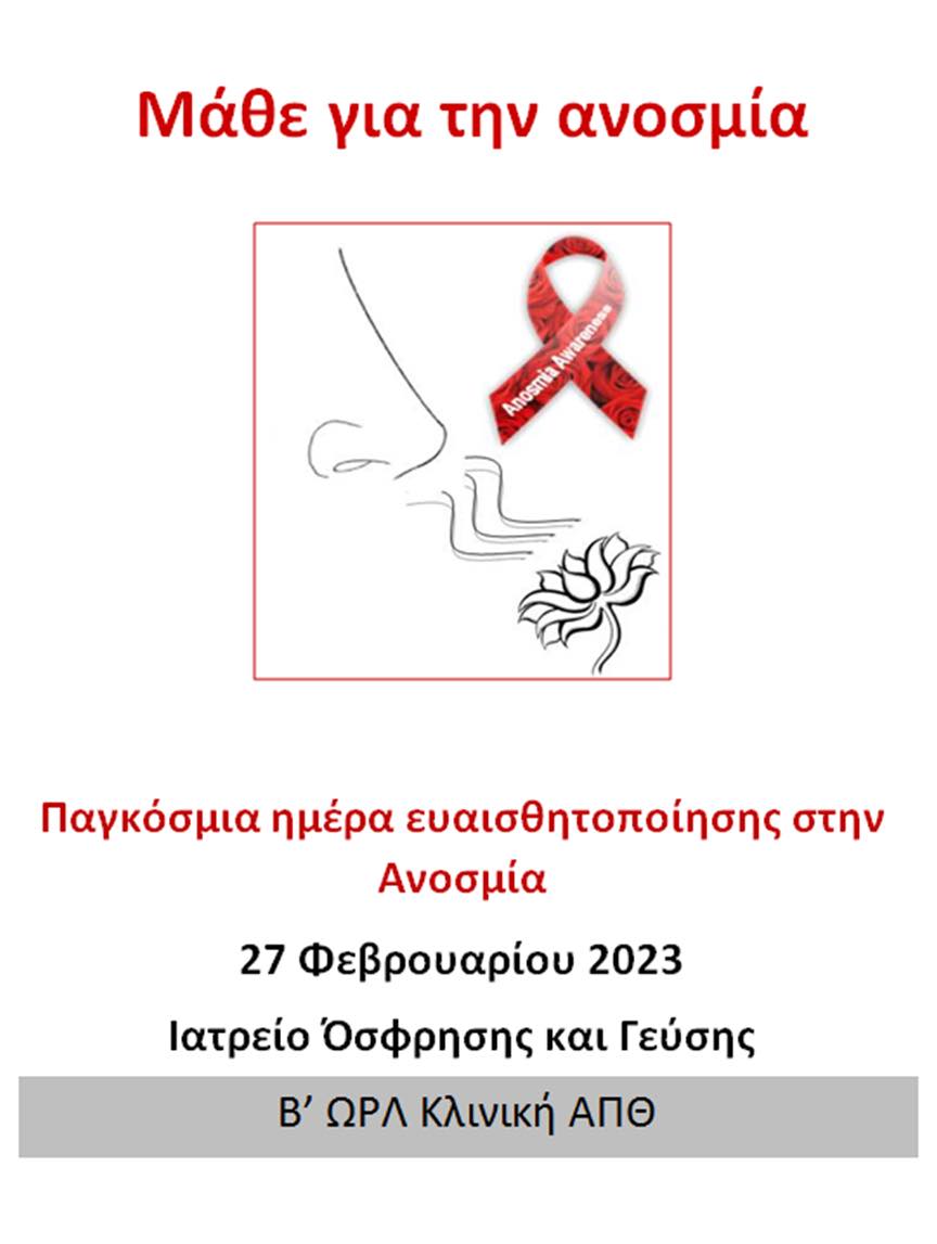 Με αφορμή την Παγκόσμια Ημέρα Ευαισθητοποίησης στην Ανοσμία (27 Φεβρουαρίου), το ειδικό Ιατρείο Όσφρησης και Γεύσης της Β Ω.Ρ.Λ. Κλινικής του ΑΠΘ στο νοσοκομείο Παπαγεωργίου της Θεσσαλονίκης διοργανώνει δεκαπενθήμερο ελεύθερης εξέτασης της όσφρησης πέραν των προγραμματισμένων ραντεβού.
