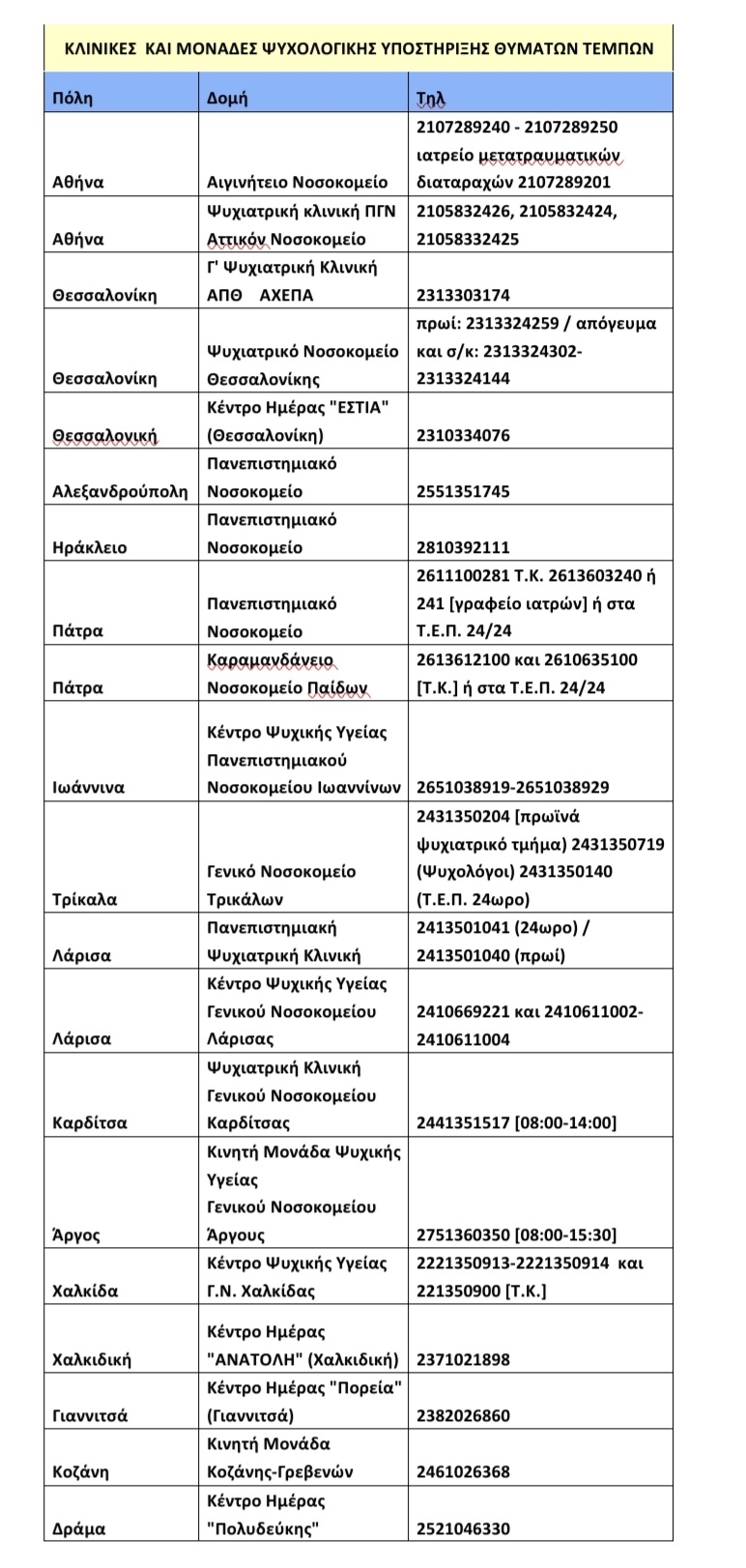 Κλινικές και Μονάδες Ψυχολογικής Υποστήριξης Θυμάτων Τεμπών