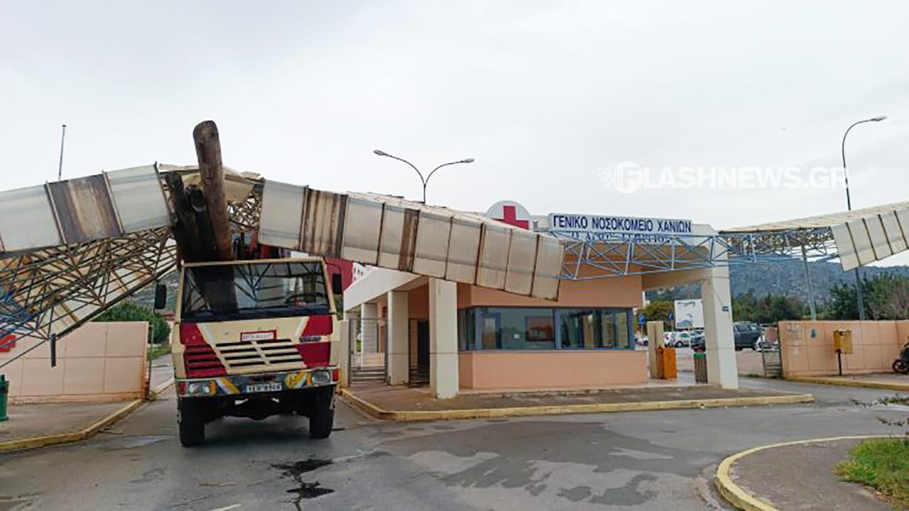 Ένα απίστευτο περιστατικό σημειώθηκε το μεσημέρι της Τρίτης λίγο μετά τις 3 όταν ένας γερανός ο οποίος έβγαινε από την πύλη του Γενικού Νοσοκομείου Χανίων χτύπησε στο στέγαστρο που υπάρχει στο σημείο γκρεμίζοντας το.