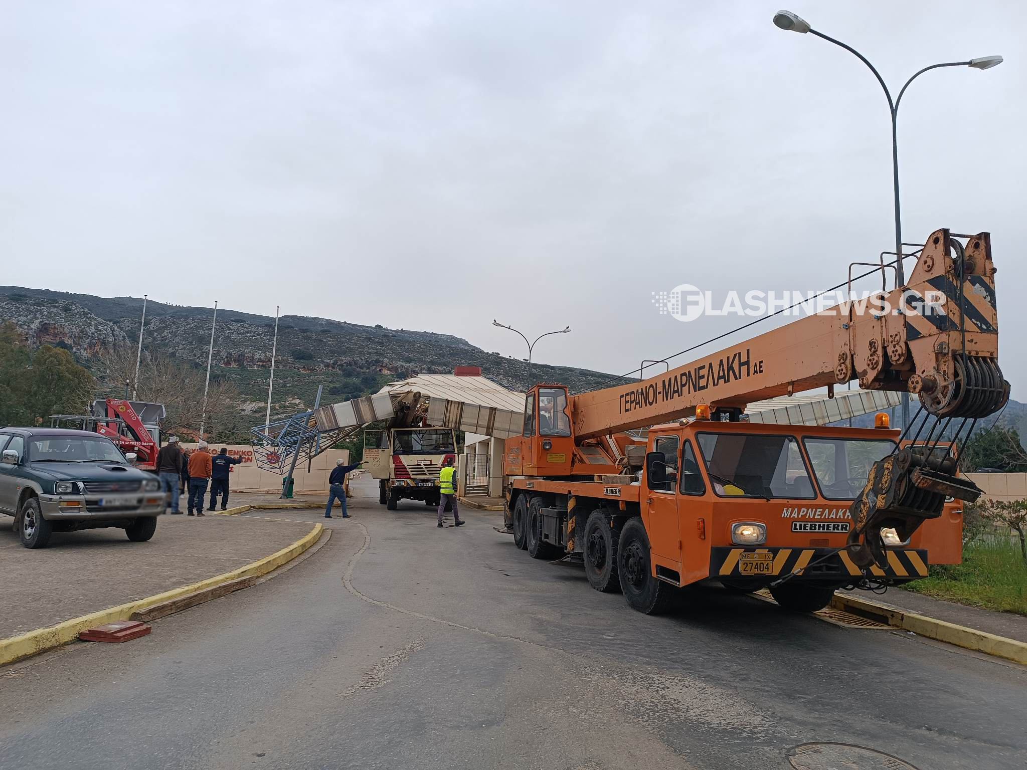Στο σημείο κλήθηκε μεγαλύτερος γερανός για να σηκώσει το στέγαστρο και να το μεταφέρει σε άλλο σημείο που να μην αποτελεί κίνδυνο.
