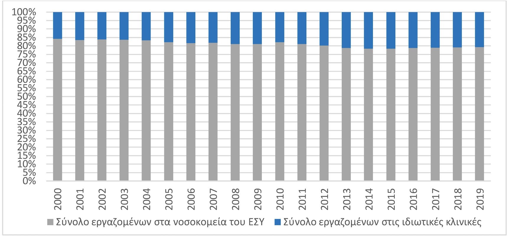 Σύνολο εργαζομένων στα δημόσια και ιδιωτικά νοσοκομεία, % συνόλου εργαζομένων στα νοσοκομεία, Ελλάδα 2000-19