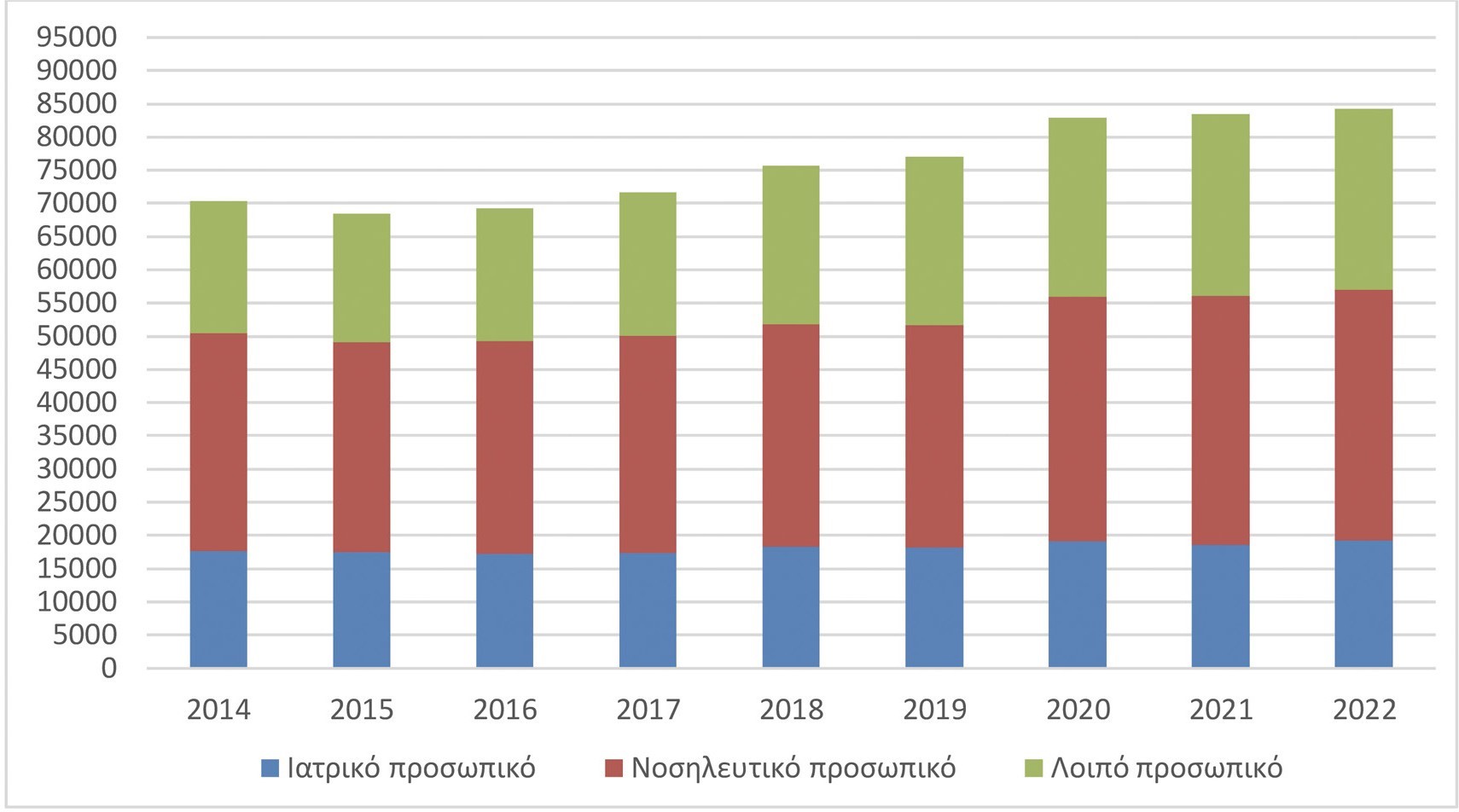 Τον Δεκέμβριο του 2022, σύμφωνα με τα στοιχεία του υπουργείου Υγείας, στα νοσοκομεία του ΕΣΥ εργάζονταν συνολικά 84.230 εργαζόμενοι, εκ των οποίων το 23% ήταν ιατροί, το 45% νοσηλεύτριες/τές και το υπόλοιπο 32% λοιπό προσωπικό.