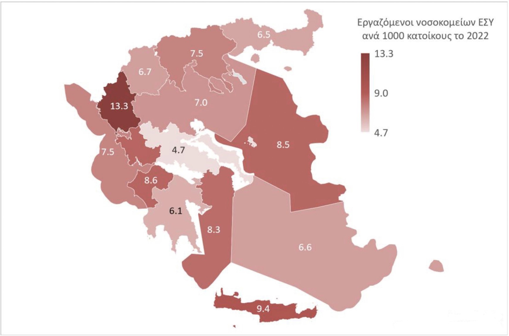 Η μελέτη παρατηρεί σημαντικές ανισότητες στην κατανομή του νοσοκομειακού προσωπικού ανά γεωγραφική περιφέρεια με τις υψηλότερες αναλογίες εργαζόμενων ανά κάτοικο να καταγράφονται κατά σειρά στην Ήπειρο, Κρήτη, Β. Αιγαίο, Δ. Ελλάδα και Αττική και τις χαμηλότερες σε Κεντρική Ελλάδα, Πελοπόννησο, Ανατολική Μακεδονία - Θράκη, Ν. Αιγαίο και Δ. Μακεδονία.
