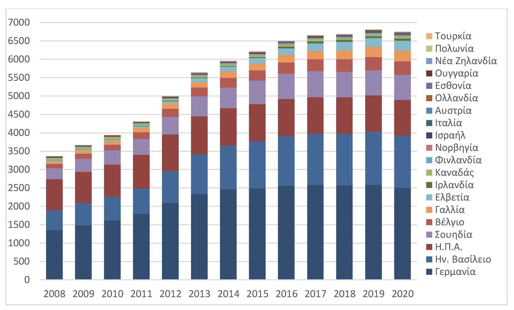 Αριθμός εκπαιδευμένων στην Ελλάδα ιατρών, ανά χώρα μετανάστευσης, 2008-20