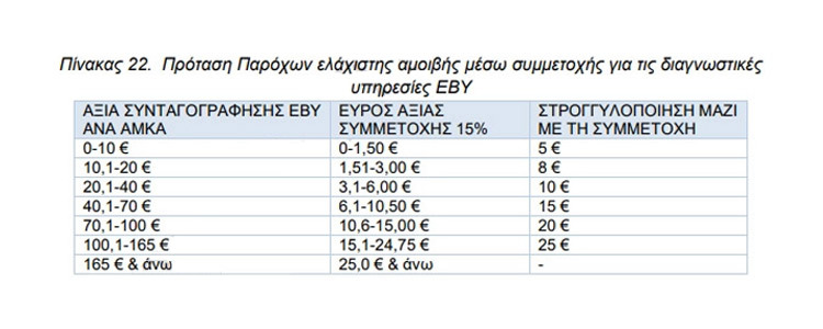 Παράγοντας που συμμετέχει στο Συντονιστικό Όργανο των Φορέων Πρωτοβάθμιας Φροντίδας Υγείας, μας ανέφερε ότι έχει ζητηθεί η θεσμοθέτηση μιας μικρής αμοιβής από τον ασφαλισμένο για κάποιες κατηγορίες εξετάσεων όπως Βιοπαθολογικές, Απεικονιστικές και Πυρηνικής που θα σχετίζεται με την αξία της διάγνωσης. Αυτή η αμοιβή, σύμφωνα με την πηγή μας, κρίνεται και δίκαιη και εύλογη για μία σειρά εξετάσεων που η διαμόρφωση της αποζημίωσής τους μετά την υποβολή του Rebate και Clawback είναι άκρως πενιχρή. Συγχρόνως, η υιοθέτηση της πρότασης αυτής θα βοηθήσει σημαντικά την ρευστότητα των παρόχων για τη διαχείριση του συσσωρευμένου 10ετούς υπέρογκου χρέους τους προς τον Οργανισμό. Κατόπιν τούτου έχει προταθεί για τις μεν απεικονιστικές εξετάσεις αμοιβή 10 ευρώ, για δε τις Βιοπαθολογικές εξετάσεις βάσει του επισυναπτόμενου πίνακα ο εξής αναμορφωμένος κατάλογος.
