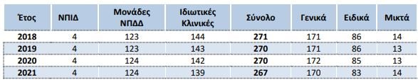 Σύμφωνα με στοιχεία της ΕΛΣΤΑΤ για το 2021, τα οποία δημοσιοποιήθηκαν σήμερα, ο αριθμός των θεραπευτηρίων μειώθηκε στις 267 μονάδες το 2021, σε σχέση με το 2020 που ήταν 270 μονάδες (μείωση κατά 1,1%).
