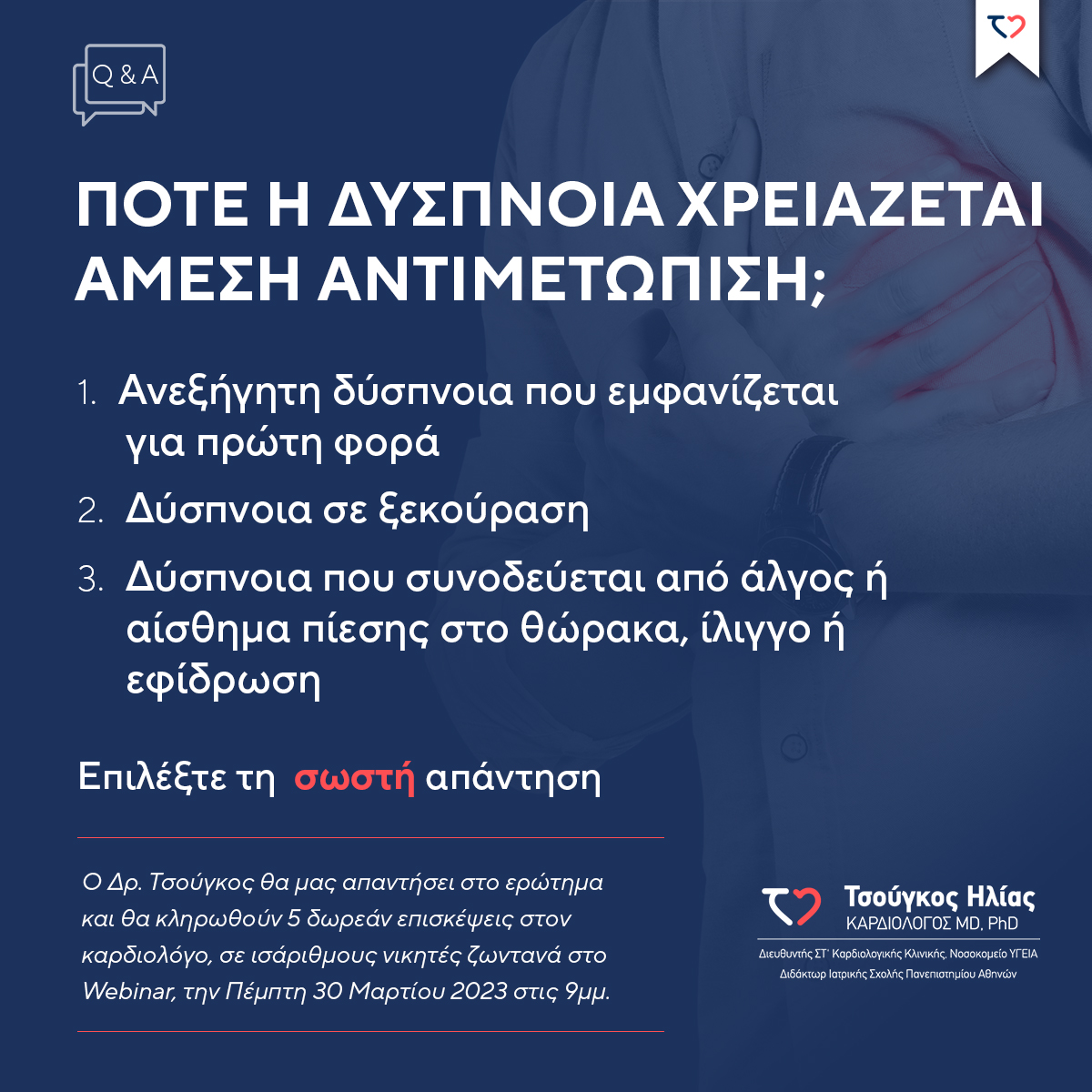 Αυτή την Πέμπτη 30 Μαρτίου 2023, στις 21:00, στο webinar «45 λεπτά με τον Γιατρό» θα συζητηθούν με τον Καρδιολόγο Δρ. Ηλία Τσούγκο, οι παράγοντες που σχετίζονται με τη δύσπνοια. Το webinar διοργανώνει το ΕΛ.Ι.ΚΑΡΔ.ΜΕΤ. (Ελληνικό Ινστιτούτο Καρδιολογίας & Μεταβολισμού).