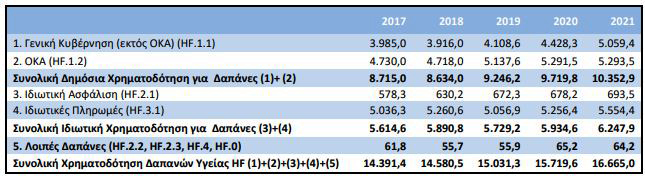 Η συνολική δαπάνη Υγείας ανήλθε το 2021 στα 16,66 δισ. ευρώ. Κυβέρνηση και Ταμεία πλήρωσαν 10,35 δισ. ευρώ, που αντιστοιχεί στο 62,2% της συνολικής δαπάνης, ενώ τα νοικοκυριά κατέβαλαν 5,55 δισ. ή το 33,3% της συνολικής δαπάνης. Οι ιδιωτικές πληρωμές εμφανίζουν σταθερή αύξηση σε μία πενταετία: το 2017 ήταν 5,03 δισ. ευρώ.