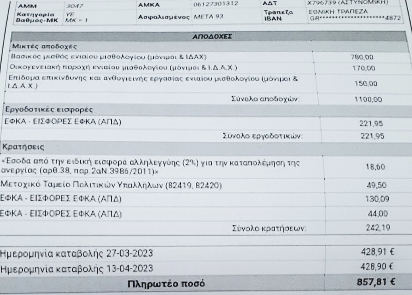 Ένας τραυματιοφορέας, χωρίς οικογενειακά επιδόματα, λαμβάνει μισθό 687 ευρώ. Στην περίπτωση που είναι παντρεμένος με τέσσερα παιδιά, λαμβάνει επιπλέον 170 ευρώ τον μήνα και ο μισθός του διαμορφώνεται στα 857,81 ευρώ, όπως φαίνεται στο εκκαθαριστικό μισθοδοσίας που ακολουθεί.