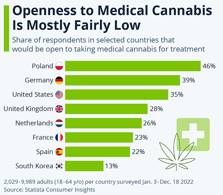Τόσο οι πολιτιστικές όσο και οι απόψεις των ατόμων σχετικά με τη χρήση ιατρικής κάνναβης διαφέρουν από χώρα σε χώρα. Όπως δείχνει το διαγραμμα το οποίο αντλεί στοιχεία από την έρευνα Consumer Insight της Statista, στην Ισπανία και τη Γαλλία, μόνο το 22 και το 23 τοις εκατό των ερωτηθέντων, αντίστοιχα, δήλωσαν ότι θα ήταν πρόθυμοι να δοκιμάσουν την ιατρική κάνναβη. Αυτό το ποσοστό είναι ακόμη χαμηλότερο στη Νότια Κορέα, όπου μόνο το 13 τοις εκατό θα σκεφτόταν να το χρησιμοποιήσει.