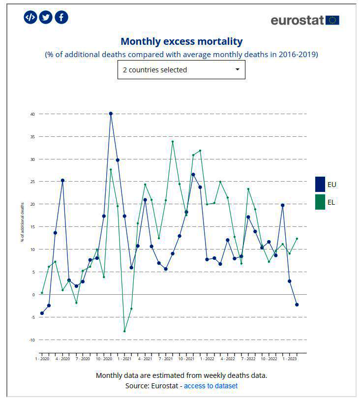 Σύμφωνα με τους υπεύθυνους της Eurostat, για πρώτη φορά από τον Φεβρουάριο του 2020, δεν παρατηρήθηκε υπερβάλλουσα θνητότητα στην Ευρώπη τον Φεβρουάριο του 2023.