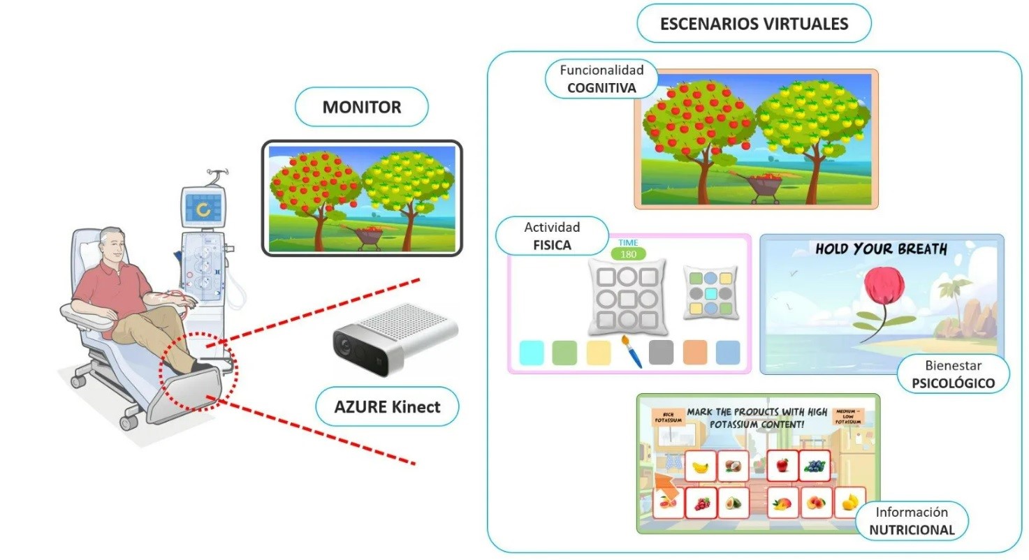 Ασθενείς με νεφρική νόσο τελικού σταδίου που υποβάλλονται σε αιμοκάθαρση περιηγούνται σε περιβάλλον εικονικής πραγματικότητας και αλληλεπιδρούν με αυτό, παίζοντας διαδραστικά παιχνίδια κατά τη διάρκεια της συνεδρίας. Με κινήσεις των ποδιών τους κατευθύνουν το καλάθι δεξιά ή αριστερά στην οθόνη ώστε να συλλέξουν τους καρπούς που πέφτουν από δύο μηλιές, παίρνουν τα κατάλληλα χρώματα από την εικονική παλέτα για να χρωματίσουν ένα μαξιλάρι ή επιλέγουν τη σωστή απάντηση σε ερωτήματα που αφορούν την υγεία τους και τη σωστή διατροφή. Με τον τρόπο αυτό, συμμετέχοντας σε διάφορα σενάρια, περνούν δημιουργικά τις ώρες της αιμοκάθαρσης, ψυχαγωγούνται, ασκούνται σωματικά και πνευματικά, ενώ εμπεδώνουν πληροφορίες που σχετίζονται με την διατροφή και τις συνήθειες που θα βελτιώσουν την σωματική και την ψυχική τους υγεία.