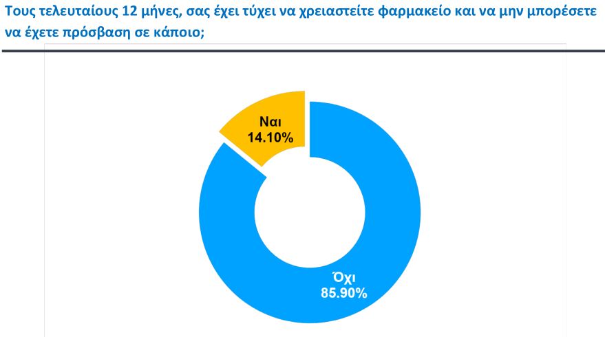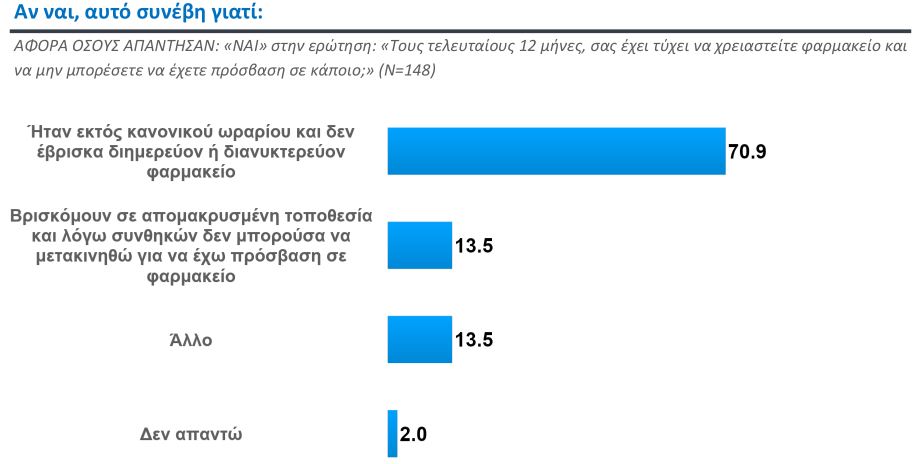Ένας στους επτά πολίτες δυσκολεύτηκε τον τελευταίο χρόνο να βρει φαρμακείο. Το 70,9% των περιπτώσεων αφορούσε ώρες εκτός ωραρίου και δεν ήταν εύκολο να εντοπιστεί εφημερεύον ή διανυκτερεύον φαρμακείο, το 13,5% αφορούσε απομακρυσμένη τοποθεσία και το 13,5% άλλο αίτιο.