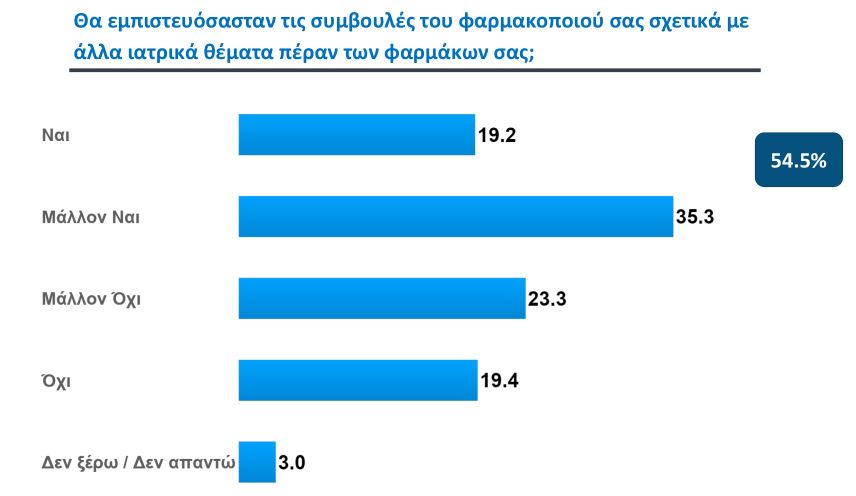 Η έρευνα έδειξε, επίσης, πολύ υψηλά ποσοστά εμπιστοσύνης των πολιτών στους φαρμακοποιούς, στους οποίους βασίζονται για τον εμβολιασμό και για μία σειρά από άλλες πληροφορίες που σχετίζονται με την υγεία τους.