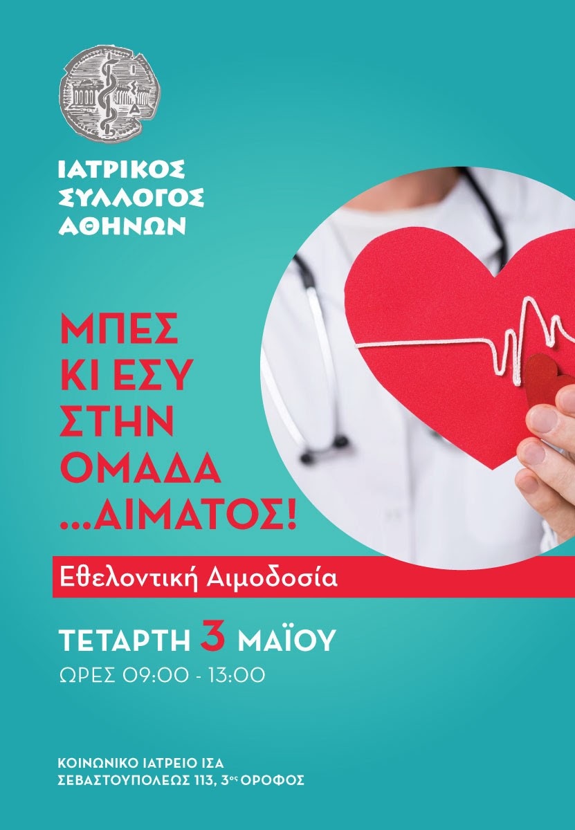 Ο Ιατρικός Σύλλογος Αθηνών διοργανώνει εθελοντική αιμοδοσία και προσκαλεί τους γιατρούς μέλη του καθώς και όσους συμπολίτες μας θέλουν να συμμετάσχουν στη ύψιστη αυτή πράξης προσφοράς και αλληλεγγύης προς τον συνάνθρωπο.