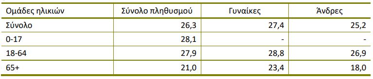 Με βάση τα στοιχεία της Έρευνας Εισοδήματος και Συνθηκών Διαβίωσης των Νοικοκυριών 2022, o πληθυσμός που βρίσκεται σε κίνδυνο φτώχειας ή κοινωνικό αποκλεισμό, ανέρχεται στο 26,3% του πληθυσμού της Χώρας (2.722.000 άτομα), παρουσιάζοντας μείωση κατά 2 ποσοστιαίες μονάδες σε σχέση με το 2021 (28,3%).