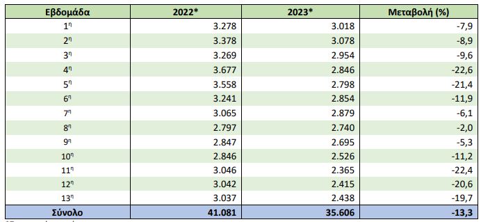 Μείωση κατά 146 θανάτους (-0,4%) σημειώθηκε σε σχέση με το μέσο όρο των πρώτων 13 εβδομάδων των ετών της περιόδου 2017 - 2022 (35.752 θάνατοι).
