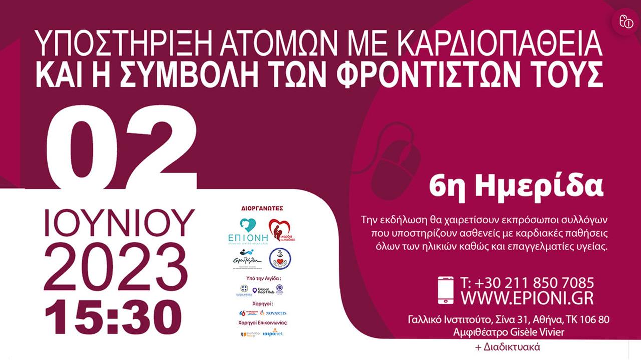 Η ΕΠΙΟΝΗ σε συνεργασία με τις ενώσεις ασθενών “η Καρδιά του Παιδιού”, “Σκυτάλη” και “Ένωση Καρδιοπαθών Αξιωματικών Π.Ν. – Λ.Σ. και Φίλων” θα πραγματοποιήσει την Παρασκευή 2 Ιουνίου 2023, στις 15:30, την 6η ανοιχτή ημερίδα με θέμα “Υποστήριξη ατόμων με καρδιοπάθεια και η συμβολή των φροντιστών τους”.