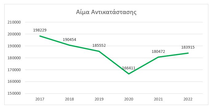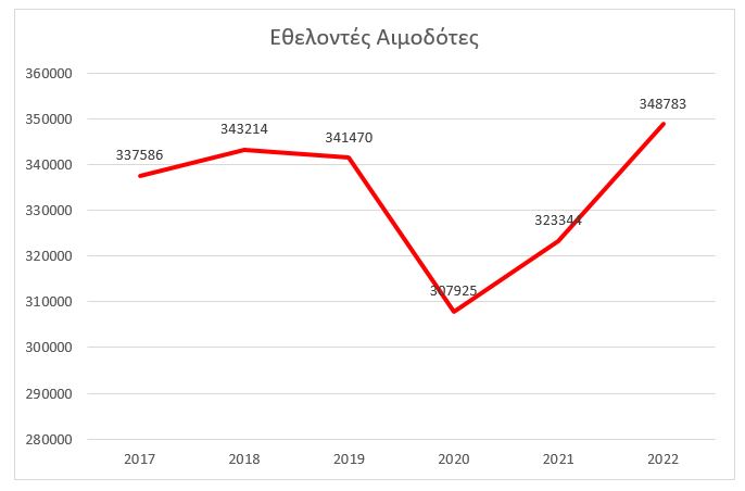 Από τις 534.494 μονάδες αίματος που συγκεντρώθηκαν το 2022, οι 348.783 συγκεντρώθηκαν από εθελοντές αιμοδότες (65,34% ).
