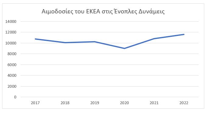 Η συμβολή των Ενόπλων Δυνάμεων στην εξασφάλιση επάρκειας αίματος στην χώρα μας είναι σημαντική και αναντικατάστατη. Έτσι, από τις ανάλογες εξορμήσεις του ΕΚΕΑ φαίνεται η συμβολή τους στον χρόνο, που σημειωτέον είναι μέρος του συνόλου.