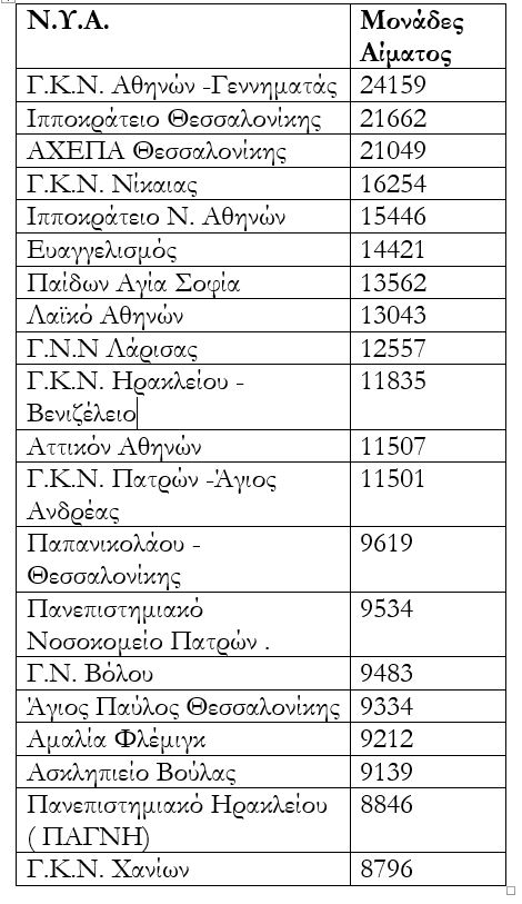 Έτσι, τα δέκα πέντε καλύτερα νοσοκομεία με κριτήριο τον αριθμό των μονάδων αίματος που συλλέγουν, είναι τα κάτωθι: