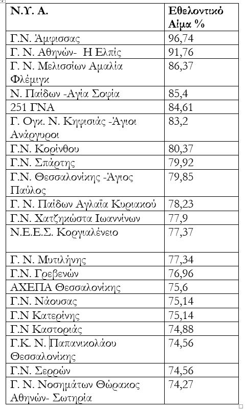 Με κριτήριο το ποσοστό του Εθελοντικού αίματος που συλλέγουν, τα είκοσι νοσοκομεία με τις καλύτερες επιδόσεις είναι: