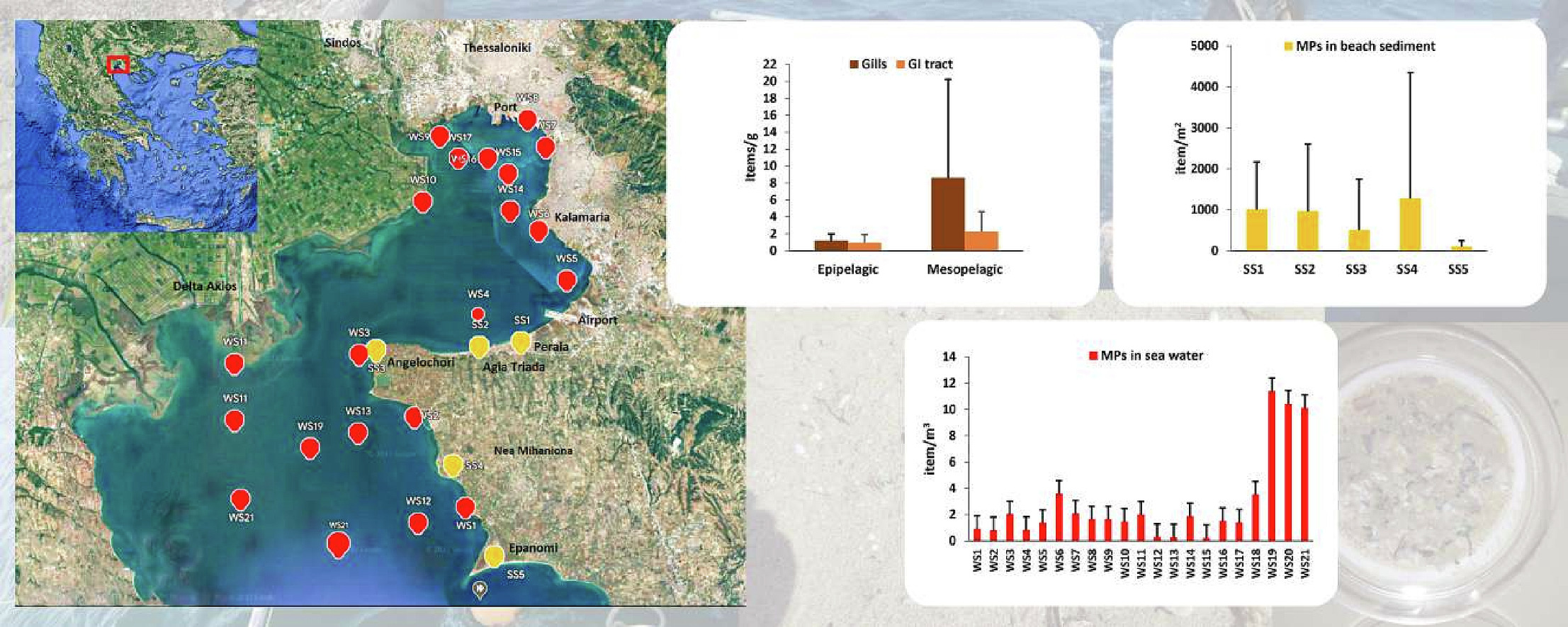 Μικροπλαστικά βρέθηκαν σε 52 από τα 72 δείγματα ψαριών, που αλιεύτηκαν με τη συνδρομή μηχανότρατας στα ανοιχτά του Κόλπου, στην περιοχή της Επανομής. Συνολικά, βρέθηκαν 244 πλαστικά μικροσωματίδια, από τα οποία τα 86 εντοπίστηκαν στα βράγχια των ψαριών και τα 158 στα γαστρεντερικά τους όργανα. Οι υψηλότερες συγκεντρώσεις καταγράφηκαν στα σώματα του Citharus linguatula (γλώσσα), το οποίο χαρακτηρίζεται ως μεσοπελαγικό είδος. Επίσης, βρέθηκαν MPs τόσο στα βράγχια όσο και στα γαστρεντερικά όργανα των δειγμάτων Trachurus trachurus (σαφρίδια), Boops boops (γόπα) και Engraulis encrasicolus (γαύρος). Τα δείγματα των ειδών Scomber colias (κολιός) περιείχαν τα λιγότερα σωματίδια.