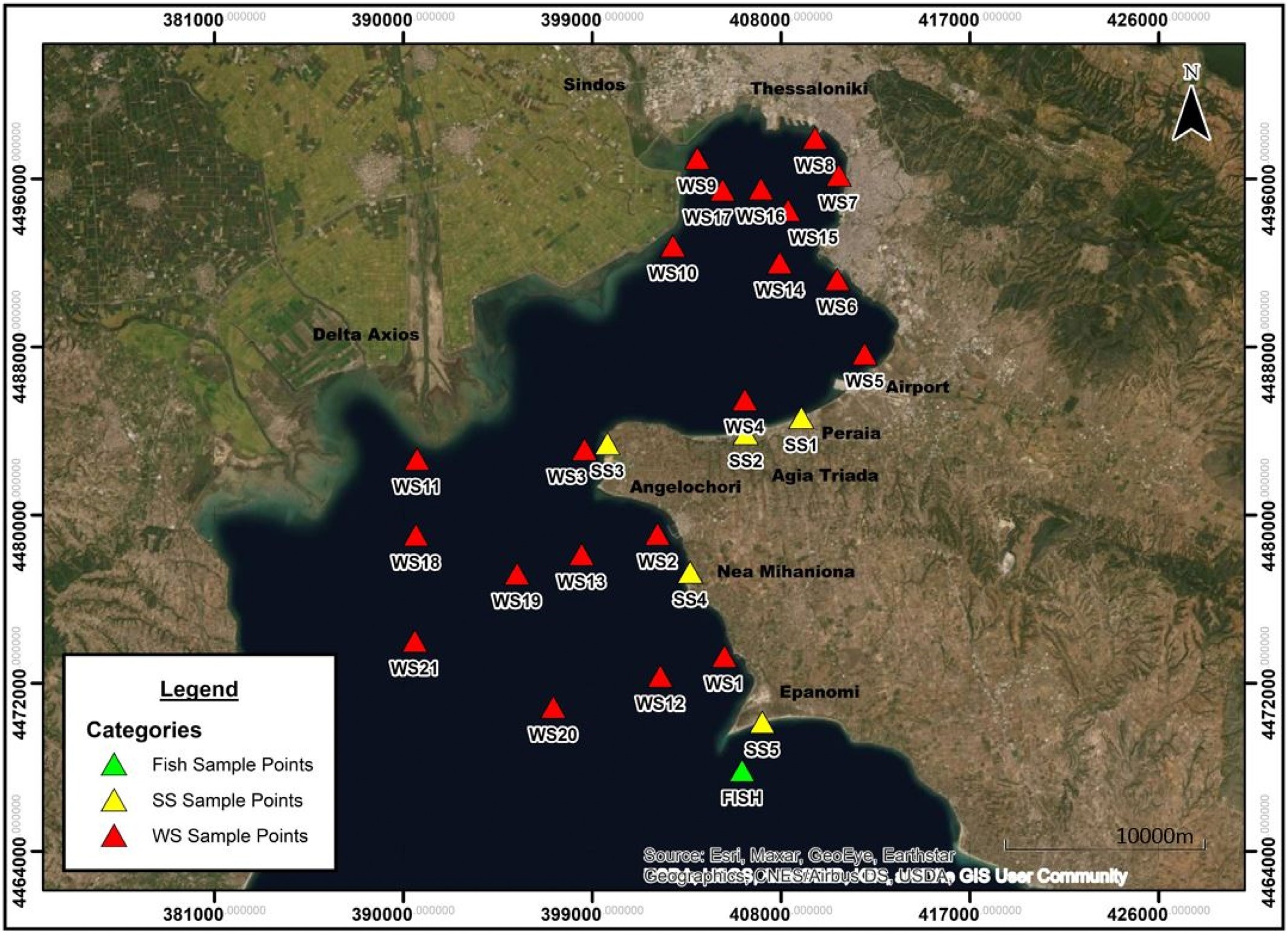 Στο θαλασσινό νερό: Συνολικά 28.523 πλαστικά σωματίδια μεγέθους <5 mm και 1740 πλαστικά κομμάτια >5 mm απομονώθηκαν από τα 21 δείγματα επιφανειακών υδάτων. Η μέση συγκέντρωση στον Θερμαϊκό Κόλπο υπολογίστηκε ως 1,9 ± 2,0 σωματίδια ανά κυβικό μέτρο ή 750.846 ± 838.028 ανά τετραγωνικό χιλιόμετρο. Όλα τα δείγματα επιφανειακών υδάτων περιείχαν μικροπλαστικά σωματίδια, γεγονός που κατά τους μελετητές υποδηλώνει ότι η περιοχή μελέτης είναι πολύ επιβαρημένη.