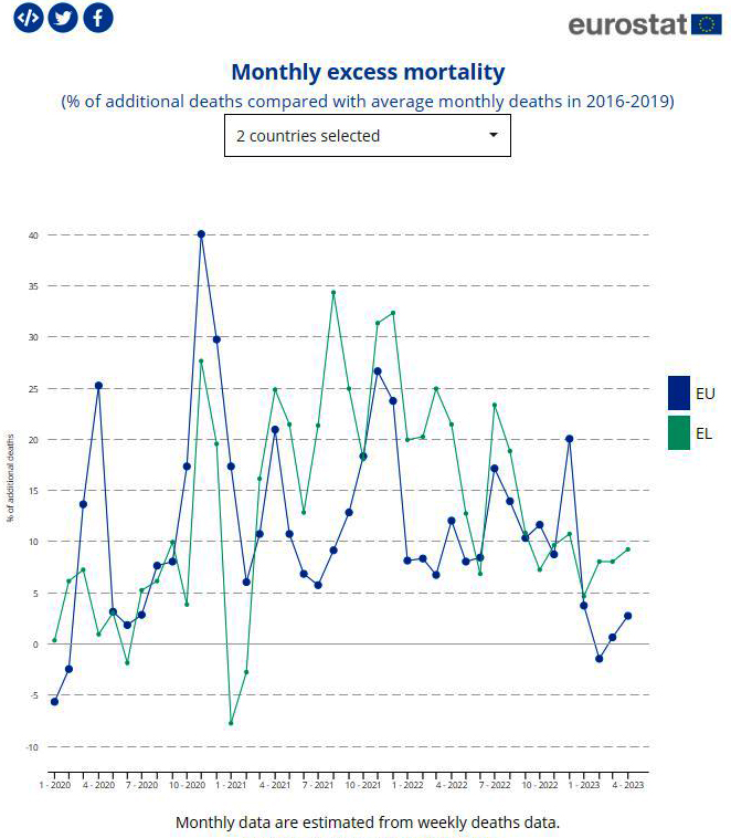 Η διαφορά της υπερβάλλουσας θνητότητας μεταξύ Ελλάδας και Ευρωπαϊκής Ένωσης αποτυπώνεται εύγλωττα στο πιο κάτω γράφημα (η Ελλάδα με πράσινο).