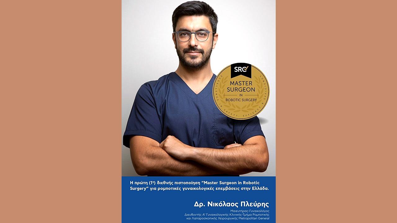 Ως “Master Surgeon in Robotic Surgery” (MSRS) για γυναικολογικές ρομποτικές επεμβάσεις, από τον εγκυρότερο διεθνή φορέα χειρουργικών πιστοποιήσεων Surgical Review Corporation (SRC) πιστοποιήθηκε ο δρ Νικόλαος Πλεύρης, Διευθυντής της A’ Γυναικολογικής Κλινικής, Τμήμα Ρομποτικής και Λαπαρoσκοπικής Χειρουργικής του Metropolitan General.