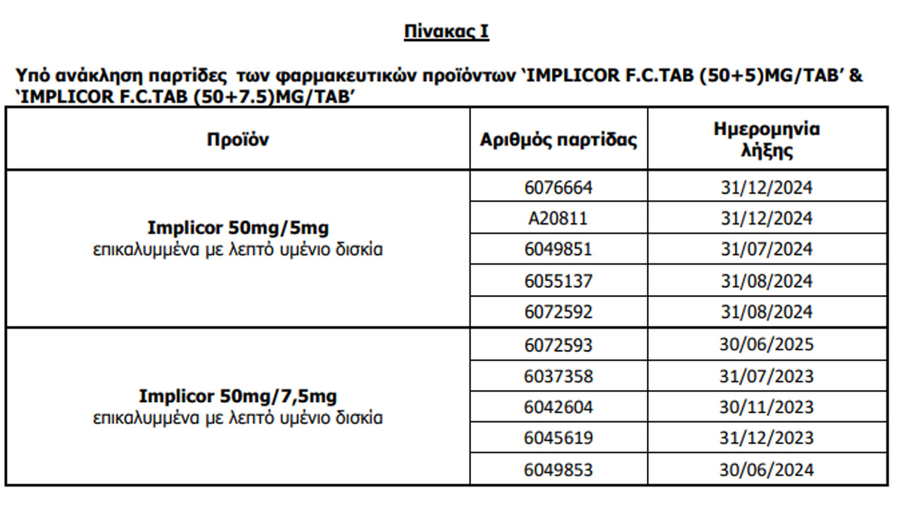 Ο ΕΟΦ αποφάσισε την ανάκληση των παρτίδων του Πίνακα Ι των φαρμακευτικών προϊόντων ‘IMPLICOR F.C.TAB (50+5)MG/TAB’ & ‘IMPLICOR F.C.TAB (50+7.5)MG/TAB’, κατόπιν ενημέρωσης από την εταιρεία SERVIER Hellas ότι σε ορισμένες παρτίδες των ανωτέρω, τα οποία περιέχουν ως δραστικές ουσίες το σταθερό συνδυασμό Metoprolol/Ivabradine, ανιχνεύθηκαν επίπεδα της ουσίας Ν-νιτροζο-μετοπρολόλης άνω του αποδεκτού ορίου της ημερήσιας πρόσληψης των 1500 ng/ημέρα, της εταιρείας Servier.
