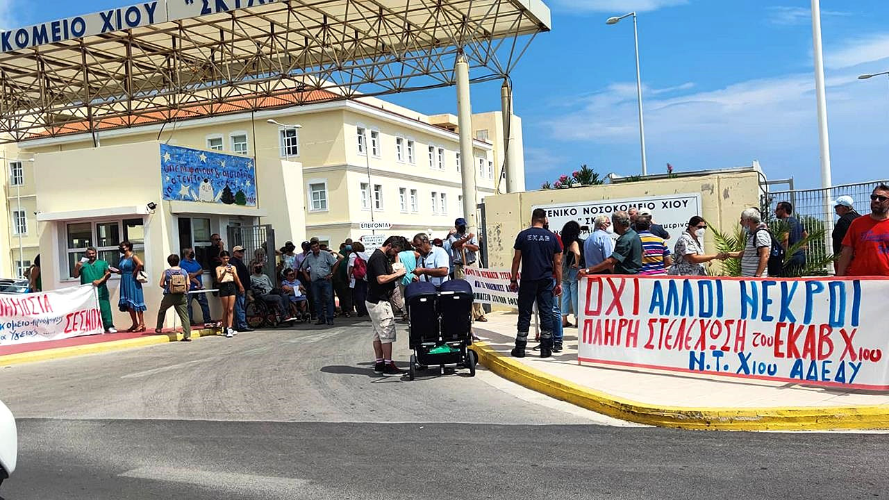 Στις 7 Ιουνίου, στη διάρκεια της συνεδρίασης του Δημοτικού Συμβουλίου Χίου, ο Μάρκος Σκούφαλος, επικεφαλής της παράταξης της Λαϊκής Συσπείρωσης, αισθάνθηκε ξαφνική αδιαθεσία και ζήτησε βοήθεια, διακόπτοντας την ομιλία του. Συνάδελφοί του χρειάστηκε να τον σηκώσουν στα χέρια, μαζί με την καρέκλα στην οποία καθόταν, και να τον κατεβάσουν στο πεζοδρόμιο, από όπου με ΙΧ αυτοκίνητο συναδέλφου του διακομίστηκε στα επείγοντα του νοσοκομείου. Αυτό συνέβη γιατί το μοναδικό διαθέσιμο ασθενοφόρο βρισκόταν σε άλλο περιστατικό.