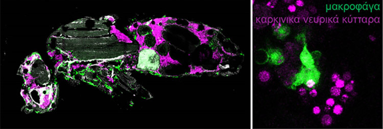 Για να μελετήσουν τους μηχανισμούς ογκογένεσης και κακοήθειας στον εγκέφαλο, οι ερευνητές του ΙΜΒΒ Χρυσάνθη Βουτυράκη, Ευανθία Ζαχαριουδάκη και ο καθηγητής Χρήστος Δελιδάκης χρησιμοποίησαν ως μοντέλο τη Δροσόφιλα, γνωστή και ως μύγα του ξυδιού, που με έναν απλό γενετικό χειρισμό μπορεί να αναπτύξει όγκους νευρικών βλαστοκυττάρων.