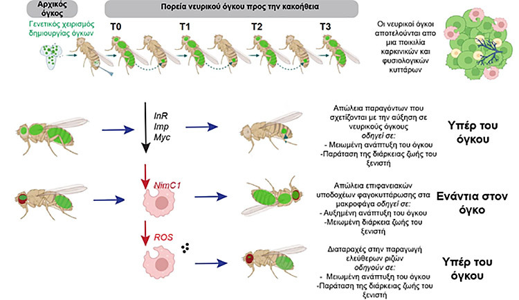 Οι ερευνητές διαπίστωσαν ότι, καθώς ο όγκος προχωράει προς την κακοήθεια, η αναπτυξιακή διαδικασία που σχετίζεται με τη νευρική διαφοροποίηση φθίνει, ενώ ταυτόχρονα ενεργοποιούνται οι διαδικασίες που σχετίζονται με αύξηση/πολλαπλασιασμό κυττάρων, τον μεταβολισμό και την ανοσοποίηση. Κάνοντας χρήση επιτηδευμένων γενετικών εργαλείων έδειξαν ότι δύο μονοπάτια που σχετίζονται με την κυτταρική αύξηση, συγκεκριμένα το ογκογονίδιοMyc και ο υποδοχέας της ινσουλίνης, είναι απαραίτητα για την εξέλιξη των όγκων προς την κακοήθεια. Επίσης διαπίστωσαν ότι τα μακροφάγα της μύγας ξενιστή (οι στρατιώτες πρώτης γραμμής άμυνας ενός οργανισμού κατά την εισβολή παθογόνων μικροοργανισμών) διεισδύουν στους όγκους και αντιστέκονται στην ανάπτυξή τους μέσα στον ξενιστή. Η παρατήρηση έδειξε ότι τα μακροφάγα τρώνε καρκινικά κύτταρα (μια διαδικασία γνωστή με το όνομα φαγοκυττάρωση) καθυστερώντας έτσι την ανάπτυξη του όγκου. Όταν στα μακροφάγα μειώσουμε έναν επιφανειακό υποδοχέα που συμμετέχει στη φαγοκυττάρωση μικροοργανισμών, αδυνατούν να δεσμεύσουν αποτελεσματικά τα καρκινικά κύτταρα, με αποτέλεσμα ο όγκος να μεγαλώνει πιο γρήγορα και να σκοτώνει ταχύτερα τον ξενιστή του. Ενώ η φαγοκυττάρωση αντιστέκεται στην εξάπλωση του όγκου, οι ερευνητές ανακάλυψαν ότι τα μακροφάγα έχουν επίσης την ικανότητα να επιταχύνουν την ανάπτυξη του όγκου μέσω της παραγωγής ελεύθερων ριζών οξυγόνου (ROS) οι οποίες συμβάλλουν στη θνητότητα του ξενιστή.