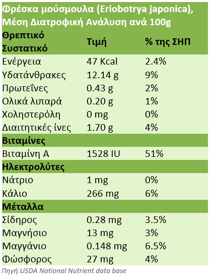 Τα μούσμουλα παρέχουν μόλις 47 θερμίδες ανά 100 γραμμάρια. Είναι πλούσια σε αδιάλυτες φυτικές ίνες και σε πηκτίνη. Η πηκτίνη διατηρεί την υγρασία στο παχύ έντερο, κατά τη διάρκεια διαφόρων λειτουργιών και δρα ως υπακτικό. Μελέτες κατέδειξαν, ότι η πηκτίνη, μειώνει τα επίπεδα χοληστερόλης στο αίμα, μειώνοντας την επαναπορρόφησή της στο παχύ έντερο.
