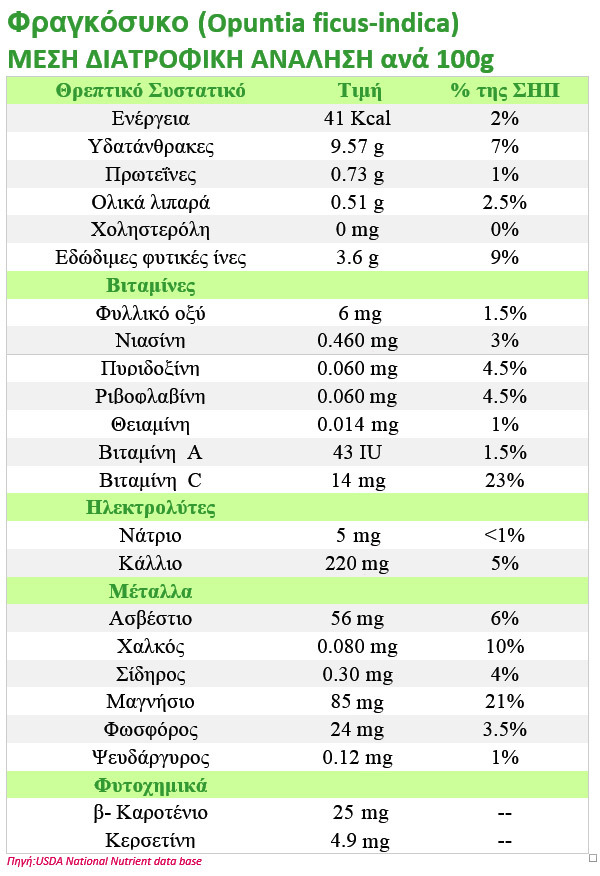 Το φραγκόσυκο περιέχει πολύτιμα μέταλλα. Το περιεχόμενο μαγνήσιο, συμβάλλει στην καλή διατήρηση των μυών και του νευρικού συστήματος και βοηθάει στην καλή πέψη.